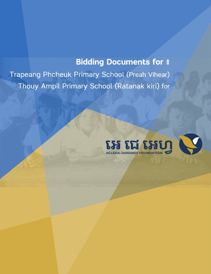 AJF now invites qualified bidders for new construction at Thouy Ampil Primary School, Thuoy Ampil Village, Cha Ung Commune, Ou Chum District, Ratanak Kiri Province and Trapeang Phcheuk Primary School, Thnal kaeng Village, Rung Roeang Commune, Rovieng District, Preah Vihear Province. All eligible bidders from eligible source countries can download, fill up form as condition in bids document attach with and submitted to Mr. Meas Socheat, 015 500 728, #61, Preah Monivong Blvd., Sangkat Srah Chork, Khan Daun Penh, Phnom Penh at/by 04:00 P.M. on 17 November 2025 (Cambodia Standard Time) with seal. The file should in original Hard of (1) Ethical Form, (2) Appendix (3) BoQ & Milestone, and (3) Appendix (4) Bids Clarification Form