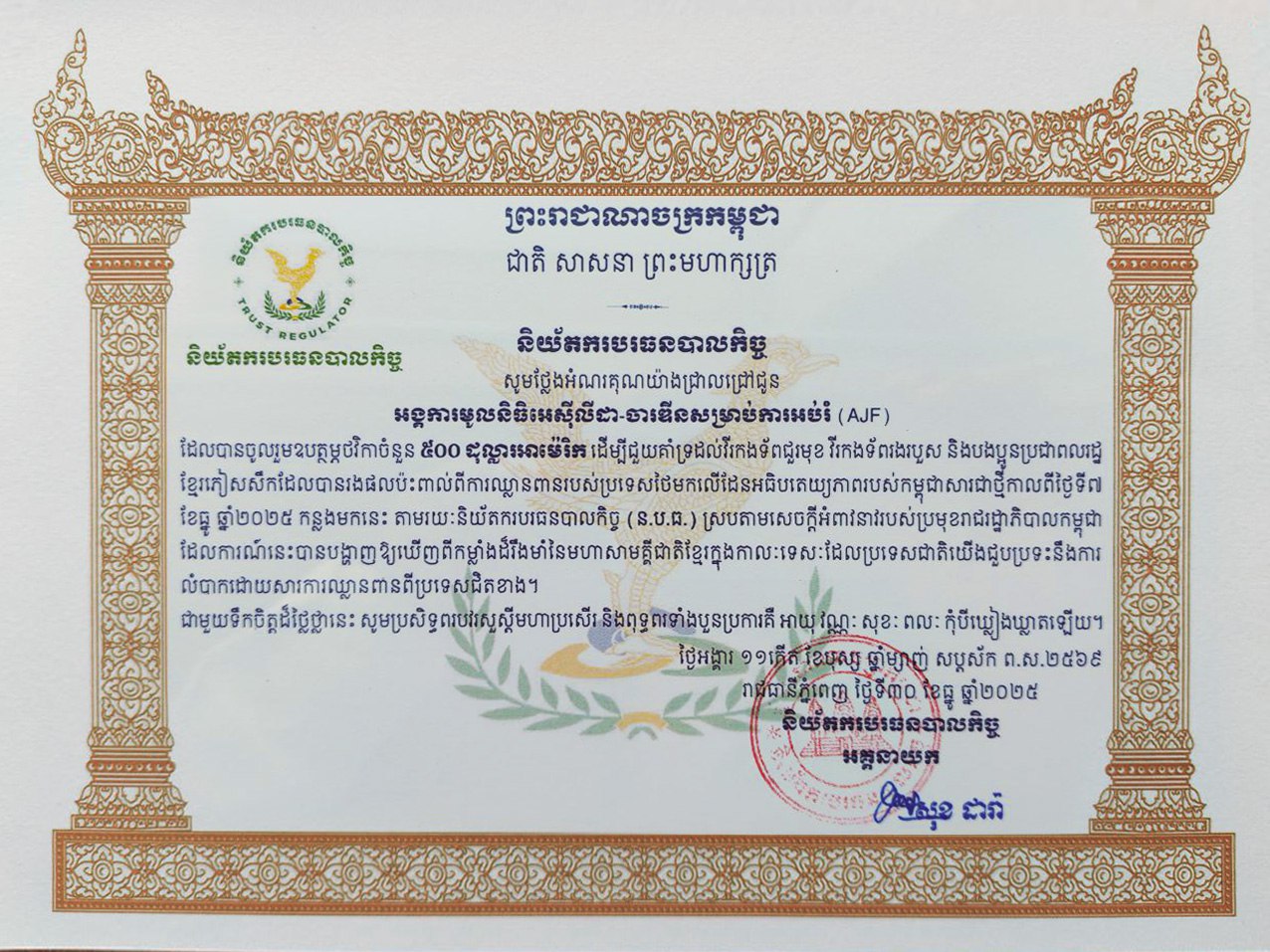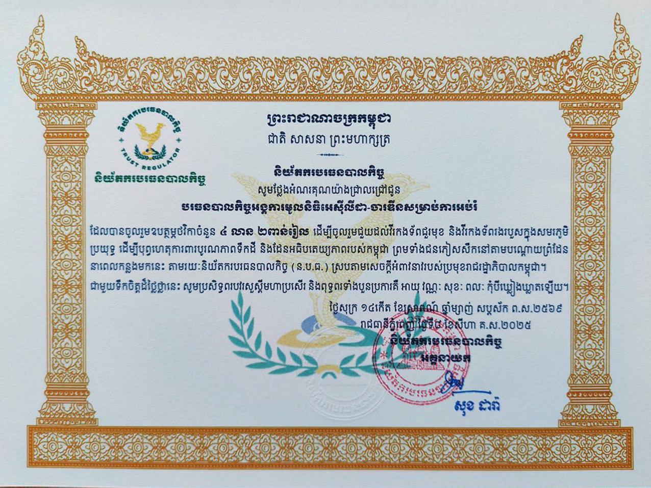 In this seminar ACLEDA-Jardines Educational Foundation obtained the appreciation letters from the trust regulator which ACLEDA-Jardines Educational Foundation contributed of 4,002,000.00 KHR and 500USD participated in the national solidarity movement "Khmer Helping Khmer" and to contribute to the Royal Government of Cambodia under the wise leadership of Samdech Moha Borvor Thipadei HUN Manet, Prime Minister of the Kingdom of Cambodia, in supporting the frontline soldiers and citizens affected by the border conflict through the Trust Regulator.